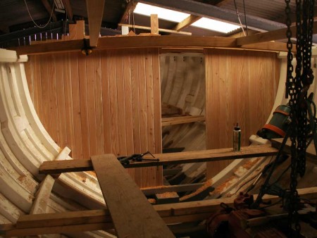 Charlie used the timber he had machined up last week to create the structural bulkhead which is made up of three layers of half inch tongue and groove. The middle layer being laid diagonally to create a superior plywood effect. This is screwed to the deck beams and sawn frames bracing them together and giving great strength and rigidity to the structure. The picture shows the bulkhead as it will be seen from the saloon looking towards the forepeak.