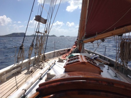 We'd decide later, whether to stop when we reached Friendship Bay or go on the extra distance to Mustique. Holly Mae was going well, first on a port tack, a couple of miles over to Isle Quatre, then about 50 yards off we went about and back on starboard to Bequia. As we closed on Bequia with Petit Nevis off to starboard, we had to put in a couple of short tacks to work our way upwind through a gap of less than two cables between the island and some rocks. Once through the gap we were out into the Atlantic swell with Friendship Bay half a mile on the port and Mustique about 6M off in a south easterly direction. We were enjoying ourselves and so decided to press on. It was a fast close reach at first to make sure we could overcome the westerly set of the current, and when half way there we were able to bear away to a fast beam reach and covered the distance in about 50 mins.