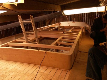 The beams and carlins for the top of the coachroof went on this week. You can see them in the picture. The gap where the ladder is emerging is where the skylight will go, and the gap further aft is for the companionway. The planking to go on these is already painted, but we can't fix it on until the beams have had a lick of paint too.