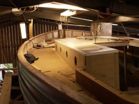 The glass matting was laid onto the coachroof and this then had a couple of coats of undercoat. We'll put the topcoat on when all other building work around there has been finished. More of the teak has been machined up for the companionway and Mark will be putting this together in his workshop which is better equipped for accurate work.